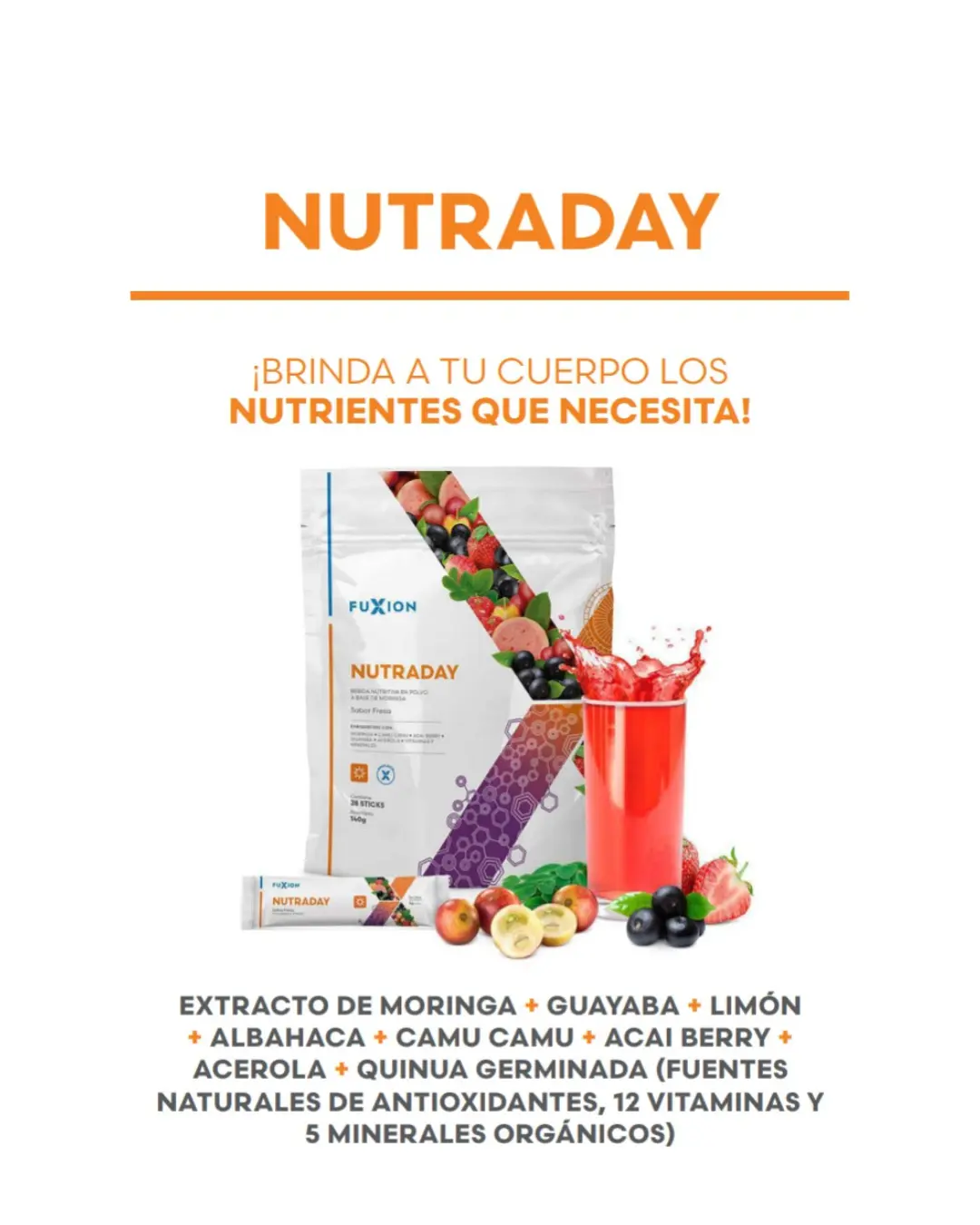 Bebida a base de moringa en polvo, guayaba, limón, albahaca, camu camu, açaí, acerola, quinoa germinada, antioxidantes, vitaminas y minerales.