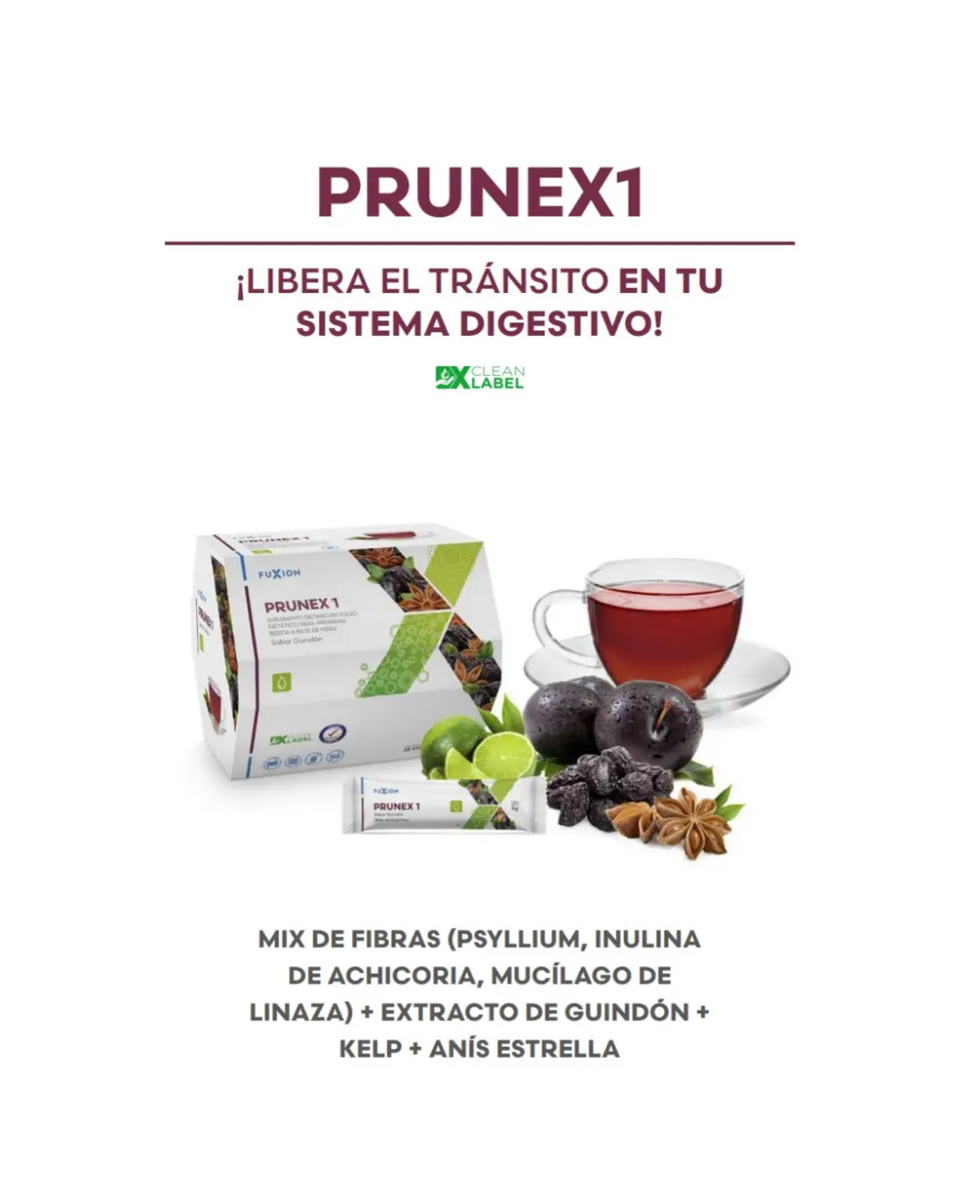 Té de ciruela, linaza, anís estrellado, psyllium, kelp, magnesio, yuca y achicoria.