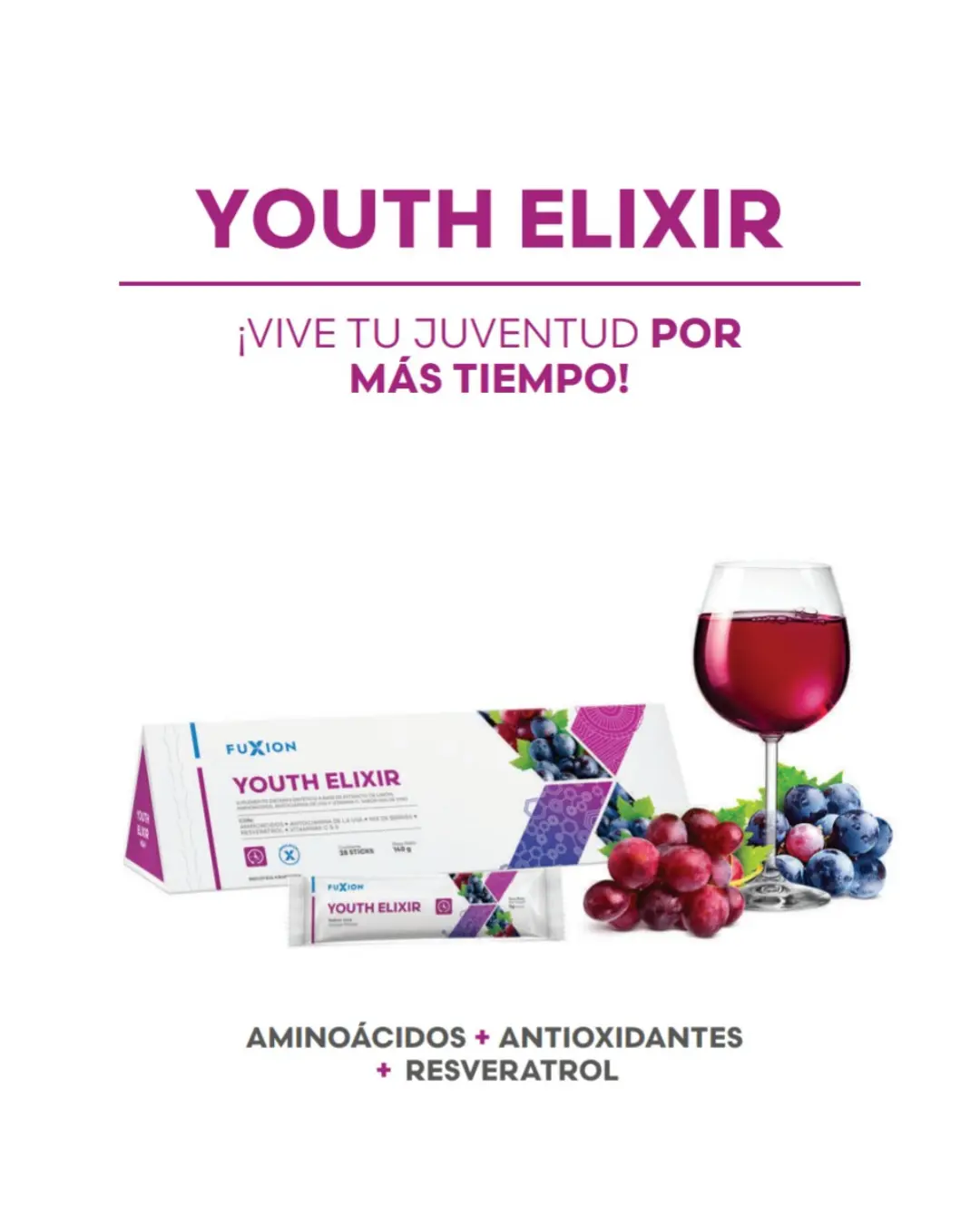 Bebida a base de uva roja, uva negra, mix de berries, antioxidantes, aminoácidos, resveratrol, espirulina, vitaminas C y E y patente nutricional Optiberry®.